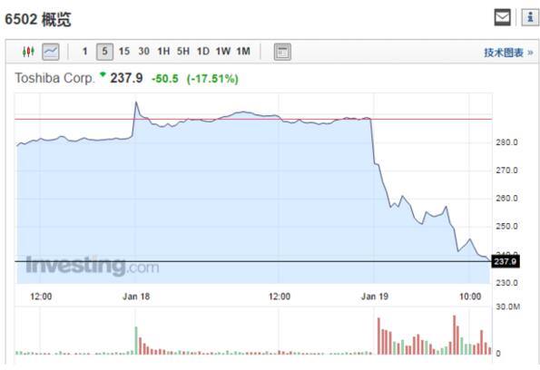 經歷一開始的熔斷之后,東芝股票現已暴跌超過17%,當前報238.2。 相比之下,日經225指數今日上漲0.9%。