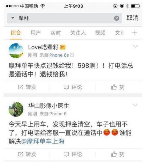 “摩拜單車快點退錢給我!598啊!!打電話總是通話中!退錢給我!”