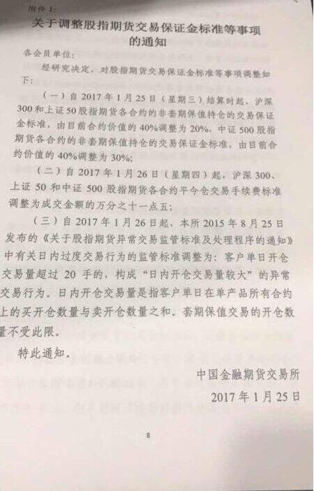 期指松綁傳聞再起。20日上午一份《關于調整股指期貨交易保證金標準等事項的通知》流出,該文件落款中金所,時間為1月25日,但并未蓋章。