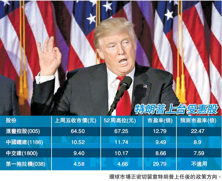 受惠「國策」的中資板塊中,基建鐵路股可選,中資基建股兼具「國企改革」及「一帶一路」雙重概念,而特朗普對跨太平洋夥伴協定(TPP)持消極態度,對於中資企業走出去的利好,可間接反映到中資基建股的股價上。個股推薦中國鐵建(1186)、中交建(1800),惟後者昨日已觸1月高位,入場需伺候低位。