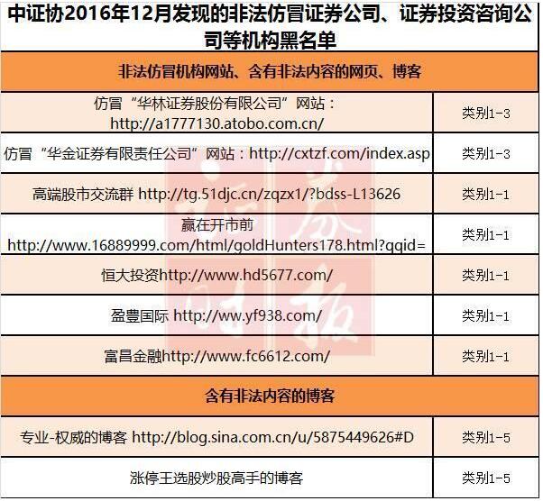 近日,中證協又公布了一批非法仿冒證券公司、證券投資咨詢公司等機構的黑名單,其中最新被扒出的,僅2016年12月份就有9家: