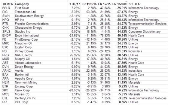 美國股市的最大輸家則是太陽能公司First Solar,自奧巴馬宣誓就職以來,已跌去75.01%。其次是近海鉆探公司Transocean,下跌了67.47,第三的是美國西南能源公司Southwestern Energy,下跌了64.47%。