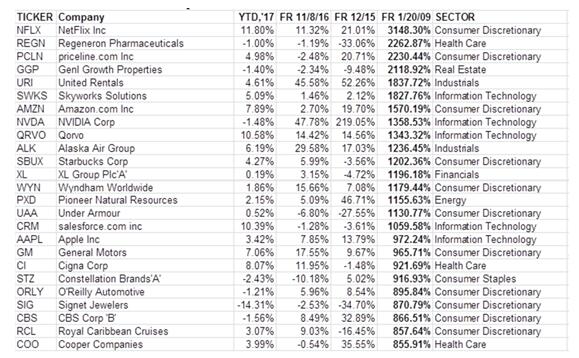 第一名是在線影片租賃提供商Netflix,自奧巴馬首次宣誓就職日以來暴漲了3148%。第二的是再生元制藥Regeneron Pharmaceuticals,上漲2262.87%,第三的是在線旅游服務網站Priceline,上漲2230.44%。