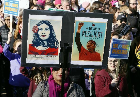 大批芝加哥民众21日涌上街头,举行“妇女大游行”抗议活动。