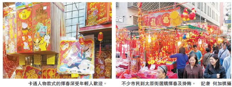 農曆新年將近,家家戶戶也準備買揮春應節過年,而在灣仔有玩具街之稱的太原街,不少商店掛滿揮春及新年掛飾,充滿新年氣氛。其中一間玩具店負責人蔡先生表示,今年的揮春成本與去年相若,而近日亦陸續有市民到來辦年貨、買揮春。而今年揮春的款式依然有傳統、亦有卡通人物款式,讓市民也可買到心頭好。他又指,年輕人一般都較喜歡選購卡通人物,而今年大熱的款式是寵物小精靈、迪士尼的人物、Peppa Pig等。