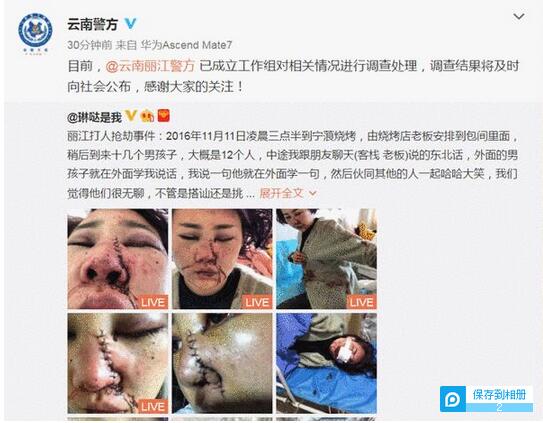 近日,有女子称她去年双十一在丽江游玩时遭十余人暴打,被酒瓶划脸录视频。1月25日上午,当地警方表示目前警方已介入处理,即将发布官方通报。而涉事店家工作人员称,女子被打地点在店外,当时打人方有人把店门关了,有人威胁他们不要多管闲事。打人者离开后,她看到女子满身是血,店员将女子扶到店里并报警,打120。而@云南警方 称,@云南丽江警方 已成立工作组对相关情况进行调查处理。