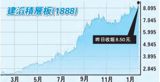 建滔孖寶近日剛齊發盈利預喜,建滔積層板預期,截至去年底止,淨溢利按年210%至220%增長,若不計及出售附屬公司錄一次性收益,淨溢利料按年增長50%至60%,主要受惠物業銷售及產品利潤率整體上升所致。