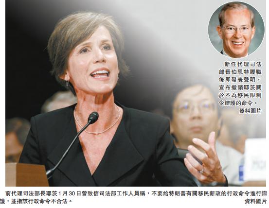 30日早些時候,耶茨致信司法部工作人員稱,不要給特朗普有關移民新政的行政命令進行辯護。她表示,給行政命令辯護不是她的職責,該行政命令也不是合法的。耶茨被前總統奧巴馬任命為司法部副部長,在前任司法部長林奇1月20日辭職後代行司法部長職務。耶茨30日的舉動意在指示司法部工作人員不要為特朗普的移民新政尋找法律上的合理解釋。不過,新任代理司法部長伯恩特30日晚履職後立即發表聲明,宣布撤銷耶茨關於不為移民限制令辯護的命令,要求司法部律師「捍衛我們總統的合法命令」。