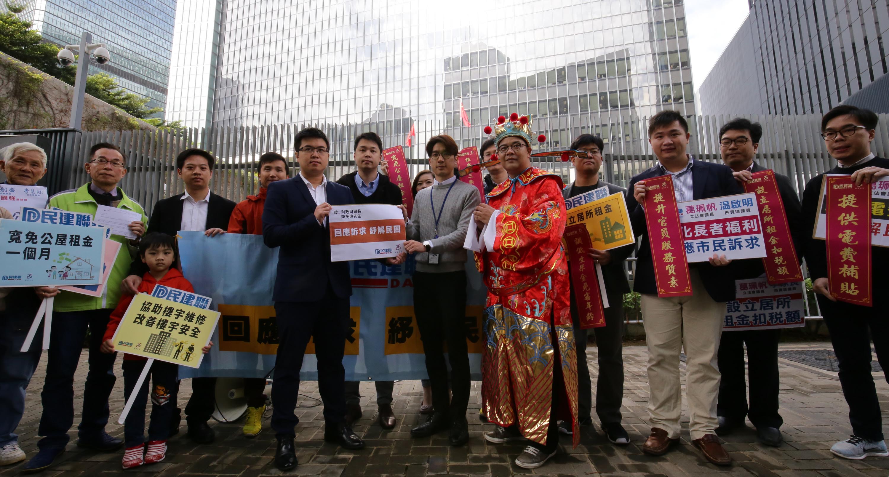 10多名民建聯成員昨日向政府總部遞交請願信,期望特區政府在下月公布的財政預算案時,充分利用盈餘,積極調撥資源,以回應市民訴求。黃大仙區議員黎榮浩更以財神造型,接過一眾成員寫上訴求的揮春,代表「財爺」收到市民訴求。黎笑言,他的財神造型未有佩戴鬚,代表香港的新財爺陳茂波,希望新財爺可「派糖」解民困。