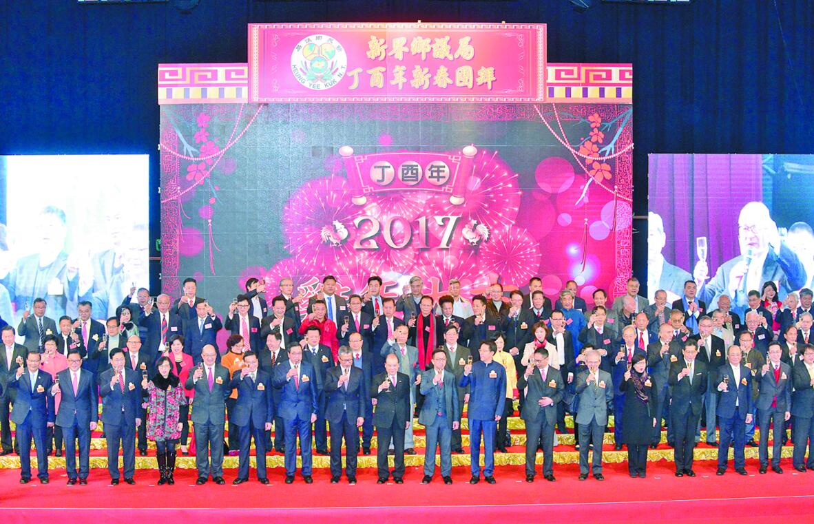 昨天上午,新界鄉議局舉行丁酉年新春團拜會,局方主席劉業強、副主席張學明、林偉強率27鄉鄉委會正副主席及議員出席團拜會,署理行政長官張建宗、中聯辦主任張曉明等政商、團體及社會賢達應邀出席,大會邀請的特首參選人中,林鄭月娥、曾俊華及葉劉淑儀均有到場。