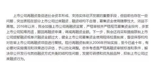 節前,證監會對上市公司再融資、大股東減持等問題做了集中回應,其中關于再融資政策的表述原文照錄如下: