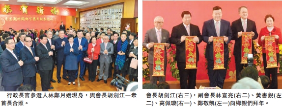 會長胡劍江,副會長林宣亮、黃書銳、高佩璇、鄭敬凱,帶領出席首長、會董、同仁,向居港潮籍鄉親及全港市民拜年,祝大家新年生意興旺、前程似錦、家庭幸福。潮州商會出席的資深會長及常董、會董向來賓及鄉親拜年,互賀新禧。