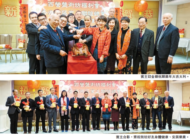【香港商報網訊】記者吳韻玲報道:西營盤街坊福利會、香港西區業主聯誼總會日前假上環北園酒家舉行「丁酉年新春團拜」酒會,西營盤街坊福利會會長李廣林指,「酉」年生肖為鸡,年干屬火,年支屬金,所以,今年稱為金鸡年,祝願各位朋友大「鸡」大利,身體健康,萬事勝意。在場約百位街坊、嘉賓互相拜年,獻上祝福。