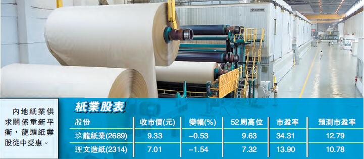 在過去的2016年裏,內地紙業供求關係重新平衡,龍頭造紙公司議價能力不斷增強,加之集裝箱板同舊瓦楞箱(OCC)價格持續上漲,龍頭紙業股從中受惠。上月23日,隨玖龍紙業發盈喜報告,當日股價升近8%,創逾五年半新高,更帶動紙業板塊集體上升,其中理文造紙、晨鳴紙業(1812)、陽光紙業(2002)等升幅2%至4%不等。