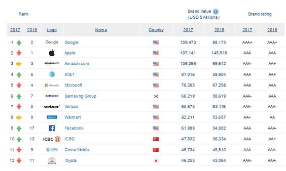 2017全球品牌500強:谷歌超蘋果奪冠 中國工商第十