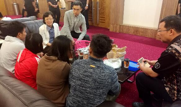 中国驻哥打基纳巴卢总领事陈佩洁(左中)6日为沙巴州沉船事故获救中国游客送行。