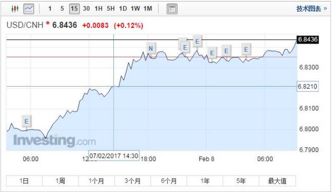 截至目前,離岸人民幣兌美元報6.8436;在岸人民幣兌美元現報6.8858。