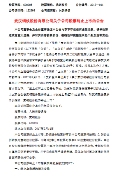 終止上市后,武鋼股份股東持有的公司股票將按照1:0.56的比例轉換為寶鋼股份股票,即每1股本公司股票可換取0.56股寶鋼股份股票。