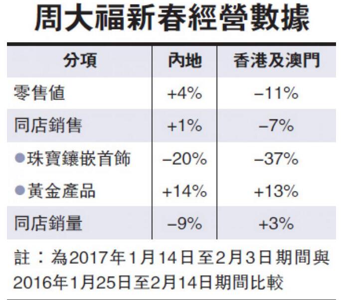 周大福昨日公布未經審核主要經營數據,於農曆新年期間(即2017年1月14日至2月3日,涵蓋農曆新年前14日至首7日),香港及澳門的同店銷售錄得下跌7%,而去年的農曆新年期間(2016年1月25日至2月14日)則下跌22%,即是說今年新春銷售錄得顯著好轉,整體零售值跌幅亦收窄至11%,亦較2016年春節23%的跌幅明顯改善。