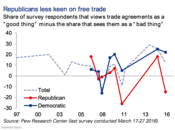高盛分析師指出,如今共和黨的支持者越來越懷疑自由貿易,這為關稅的實施鋪平道路。