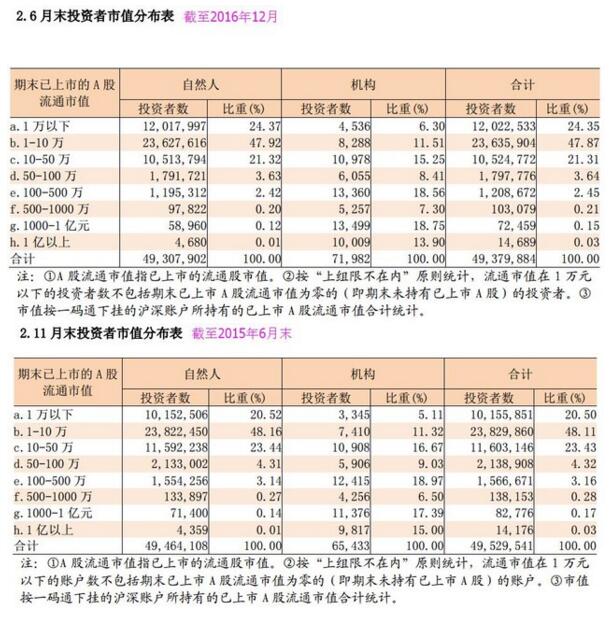 中證登最新的投資者市值分布數據顯示,截至2016年12月,超過億元的個人投資者賬戶數量超過了2015年6月時的水平,而市值500萬以下的相關賬戶數量全線低于當時水平。而去年底的機構投資者賬戶數量也超過當時水平。