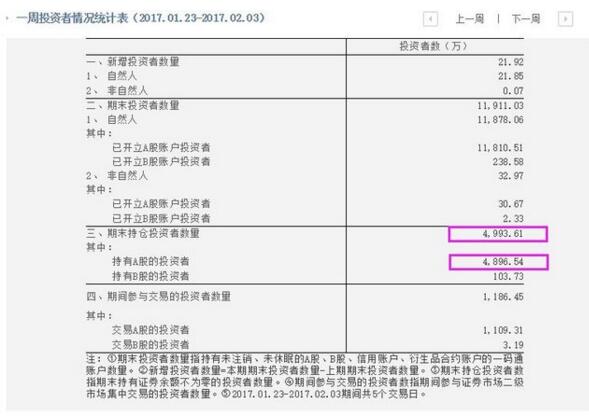 中國證券登記結算有限公司數據顯示,截至上周五(1月23日-2月3日),持倉投資者數量罕見跌破5000萬人,至4993.61萬,在期末投資者總量中的占比下滑至42%。其中,A股持倉投資者數量為4896.54萬。