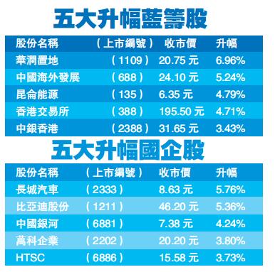 藍籌方面,港交所(388)午后飆高,曾升5.2%,收市升4.7%報195.5元,另外友邦(1299)升0.7%;匯控(005)升0.5%。相反,騰訊(700)跌0.7%;中海油(883)跌1.2%;百麗(1880)跌1%。