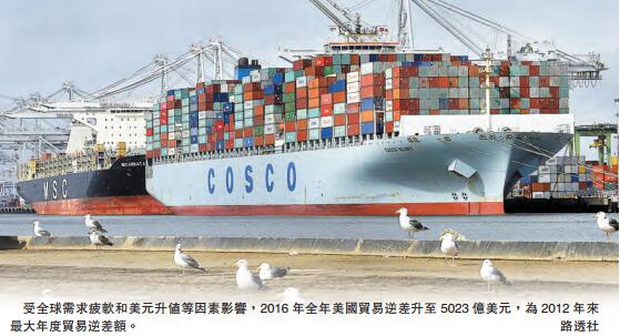【香港商報網訊】美國總統特朗普政府最為敏感的貿易數據出爐:商務部周二公布報告指出,美國去年12月貿易逆差縮小3.2%至442億美元。雖然12月貿赤有些微縮減,但幅度仍不足,使去年全年貿易逆差達5023億美元(約合3.9萬億港元),創2012年來新高。有分析認為,這將為特朗普主張美國需更強硬的貿易措施增添柴火。