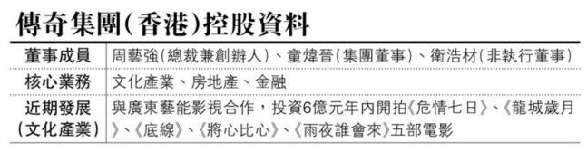 「傳奇影業及娛樂集團」公告,只提到該公司主要從事文化產業及房地產開發及投資業務,股東包括衛浩材及童煒晉。根據傳奇集團(香港)控股的網頁資料,該公司總部位於北京,在香港和上海設有分部,主要從事文化產業投資及相關地產項目開發。傳奇集團旗下設有四家子公司,分別從事全球影視媒體投資,文化地產投資,以及文化產業類企業的股權併購和整合。