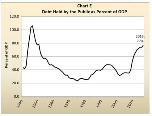 按照面向公眾負債的14.2萬億美元來算,美國債務占GDP之比(the debt-to-GDP ratio)在2016財年升至77%。