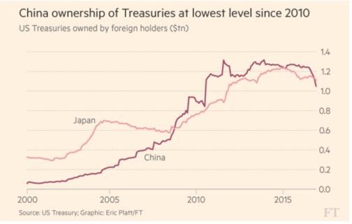 去年中下旬以來,全球央行開啟狂拋美債模式。據美國財政部在華盛頓公布的月度報告顯示,2016年11月,中國共持有1.05萬億美元的美國政府債券,較10月減少664億美元,創下了2011年12月以來最大單月降幅。