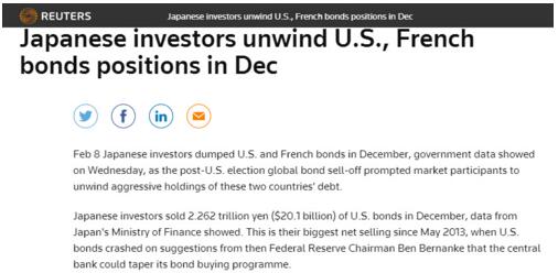 美債作為世界公認的安全資產之一,卻在特朗普上臺后不斷以創紀錄的方式被拋售!2月8日,路透社援引日本財務省消息稱,日本投資者在12月份拋售2.262萬億日元(201億美元)的美國債券,創下2013年5月以來最大凈拋售規模。