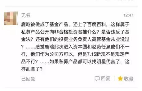 但是我們認為,這種趨勢是有問題的。比如任泉等明星都沒有說發過什么產品,沒有炒作和推廣自己名字命名的產品。公募產品可以公開宣傳,一般產品名氣會比私募產品大,但是大家都知道鹿晗,產品發出去以后可能比公募的更有名。但是畢竟私募和公募的區別在于公募是可以公開宣傳的,私募是不得公開宣傳的。”