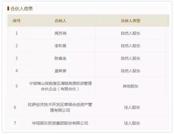 基金君檢索工商注冊信息,“清晗基金”工商注冊名稱是寧波梅山保稅港區清晗股權投資基金合伙企業(有限合伙),股東包括自然人高蘇堯、陳春連、李昕昊、盛希泰,還有寧波梅山保稅港區清晗高源投資管理合伙企業(有限合伙)(下面簡稱“清晗高源”),另外還包括企業法人拉薩經濟技術開發區草根合創資產管理有限公司(下面簡稱“草根合創”)和華視娛樂投資集團股份有限公司(下面簡稱“華視娛樂”)。