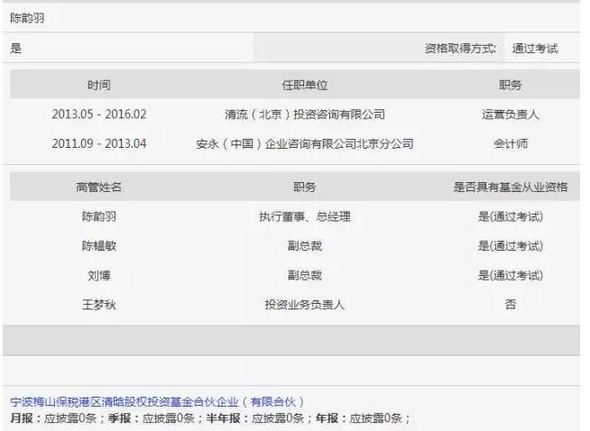 而備案清晗基金的私募公司主體——寧波清流和盛投資管理有限公司,其法定代表人是陳韻羽,系清流(北京)投資咨詢有限公司的運營負責人,美麗說老板娘、清流資本董事總經理王夢秋則是這家公司的投資業務負責人。值得注意的是,這家公司旗下只備案了清晗一只基金,并無其他備案產品,同時王夢秋并不具備基金從業資格。