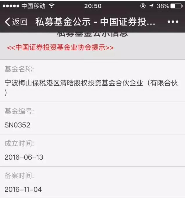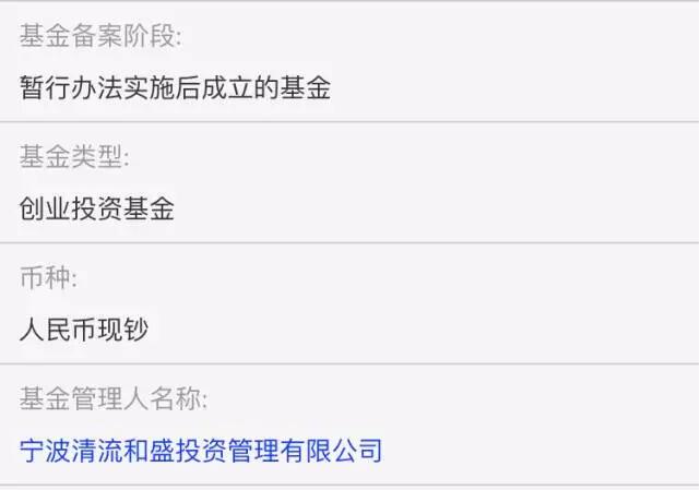 全稱是“寧波梅山保稅港區清晗股權投資基金合伙企業(有限合伙)”,備案在“寧波清流和盛投資管理有限公司”這家私募機構的名下,屬于創業投資基金,成立于2016年6月13日,備案時間是2016年11月4日,托管人是招商銀行,主要投資領域是境內項目的私募股權投資。