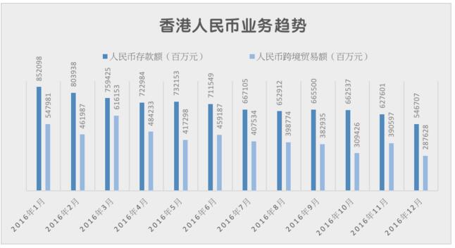 香港人民幣跨境貿易額大幅下跌,與兩地貿易減少有關。2016年內地與香港貿易額為3052.5億美元,同比下降11.1%。貿易疲弱,拖低人民幣跨境貿易結算。除此之外,人民幣匯率波動,企業減少持有人民幣存款,也導致資金池萎縮。