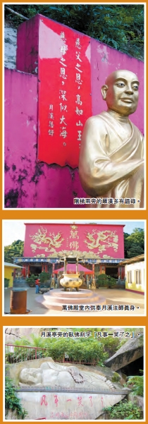 拾級而上至青山環抱萬佛寺,月溪法師在1949年建設,於1957年落成,寺院佔地65,000平方呎,分成高低兩組建築群,共有5殿、4亭、1廊及1塔。首先,步入低層建築萬佛殿,欣賞大殿四周牆壁上1.2萬尊金佛,再於殿中央誠仰端坐圓寂的「月溪法師」,法師身披袈裟。