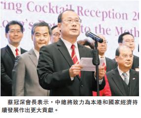 適逢今年是香港回歸祖國及特區成立20周年,蔡冠深期望工商及社會各界在新一年團結一致、理性溝通,齊心協力發展經濟、改善民生,積極參與國家對外開放,抓緊區域經濟合作新機遇,續寫香港經濟繁榮的新篇章。