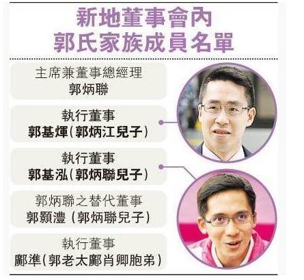若郭炳湘、郭炳江及郭炳聯各分到6245萬股,按去年新地派息3.85元計,每人每年又可增加股息2.4億元。在郭氏家族信托減持股份的同日,旗下亦多出兩家離岸公司,分別名為Shorex Financial和Irpinia,各持有新地4500和4437股股份,未知持股人。分析員表示,該等公司可能是為第三代部署,不過目前持股量微小,暫時看不出真實用途。