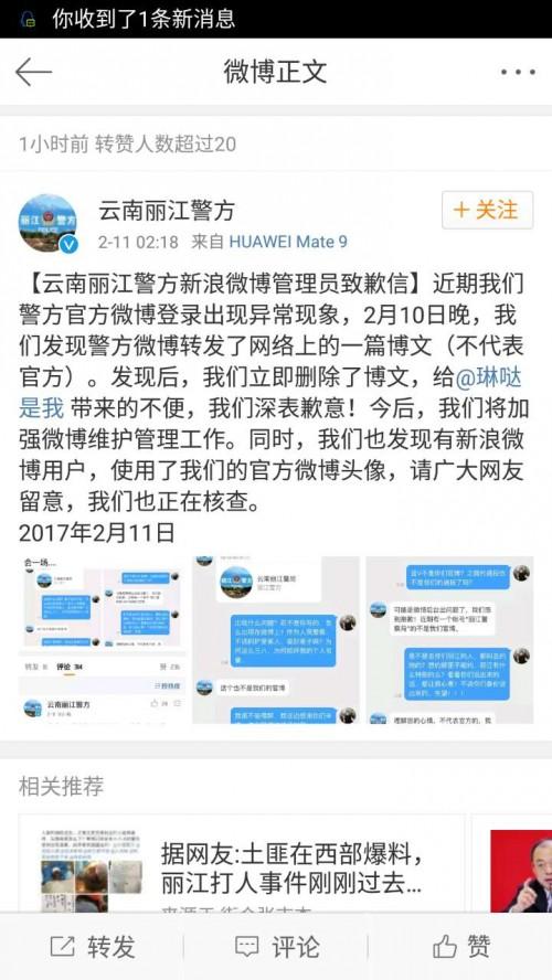 今天淩晨,雲南麗江警方官方微博管理員發布致歉信:“近期我們警方官方微博登錄出現異常現象,2月10日晚,我們發現警方微博轉發了網絡上的一篇博文(不代表官方)。發現後,我們立即刪除了博文,給@‘琳噠是我’帶來的不便,我們深表歉意!今後,我們將加強微博維護管理工作。同時,我們也發現有新浪微博用戶,使用了我們的官方微博頭像,請廣大網友留意,我們也正在核查。”