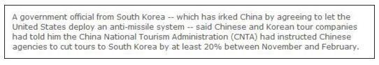 路透社此前的一篇報道還稱,中國通過控制去韓國的旅游團來表達對韓國的不滿。一名韓國官員說,中國和韓國的旅游公司告訴他說,中國國家旅游局(CNTA)要中方(旅游)機構在11月和2月之間削減至少20%的前往韓國的旅行團。