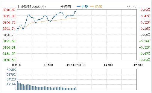 今日早盤A股高開高走,滬指站上3200點關口。權重股大幅拉升,釀酒、有色、煤炭、金融、航空等板塊漲幅居前。建材、石油、鋼鐵等板塊跌幅靠前。截至午間收盤,滬指漲0.63%報3216點,深成指漲0.79%報10266點。