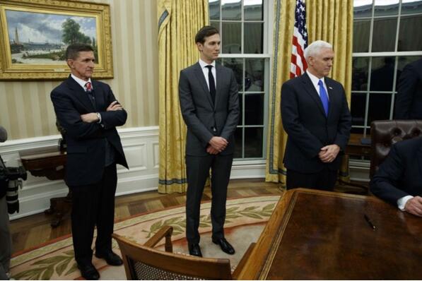 庫什納站在國家安全顧問弗林和副總統彭斯中間,可見其地位