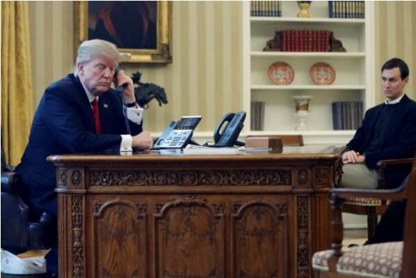 1月29日,特朗普在女婿賈里德·庫什納的注視下和沙特國王通話