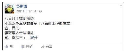 【觀察者網綜合】由于不滿蔡英文政府年金改革方案,監督年金改革聯盟發言人、退役陸軍中將吳斯懷11日在臉書上發文,表示聯盟決定從2月21日起,將動員800人在“立法院”旁邊發起為期一個月的“八百壯士捍衛權益”行動。