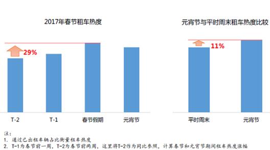 租车自驾游正在成为国民春节重要组成部分。滴滴数据显示,2017年春节大量用户选择租车自驾游,其热度从春节前一周开始升温,假期当周较半个月前高出29%,到元宵节依然维持较高热度,比平时的周末增加了11%。由此可见,除了超长“驾期”之外,不少用户选择“早出”或“晚归”,以避开出行高峰。