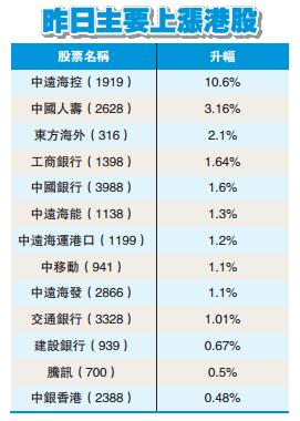 至於重磅股,騰訊(700)升0.5%,中移動(941)升1.1%。航運股續跑贏大市,上周飆升逾19%的中遠海控(1919)創最少52周新高,收升10.6%;中遠海能(1138)升1.3%;中遠海發(2866)升1.1%;中遠海運港口(1199)升1.2%;東方海外(316)升2.1%。