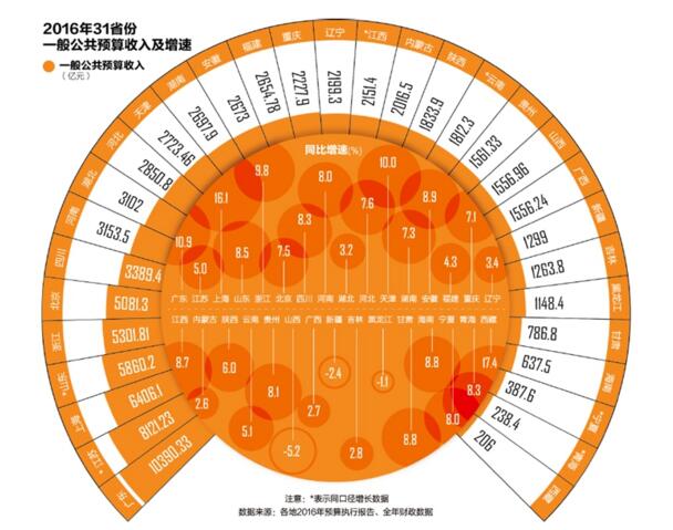 收入增速方面,西藏和上海以17.4%和16.1%遙遙領先,廣東、天津分別以10.9%和10%位列三、四位。其他省份2016年一般公共預算收入增速均未實現兩位數增長。山西、黑龍江、新疆出現負增長,其中山西以-5.2%墊底,不過好于當地年初預想。
