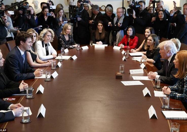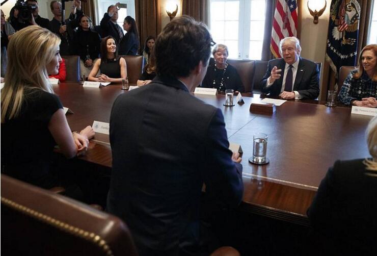 當地時間2017年2月13日,加拿大總理賈斯汀·特魯多到訪美國,與特朗普進行圓桌會議,討論女性職場勞動力問題與移民問題。美國第一千金伊萬卡首次出席白宮圓桌會議,她一直是制定有利于女性工作政策的擁護者。